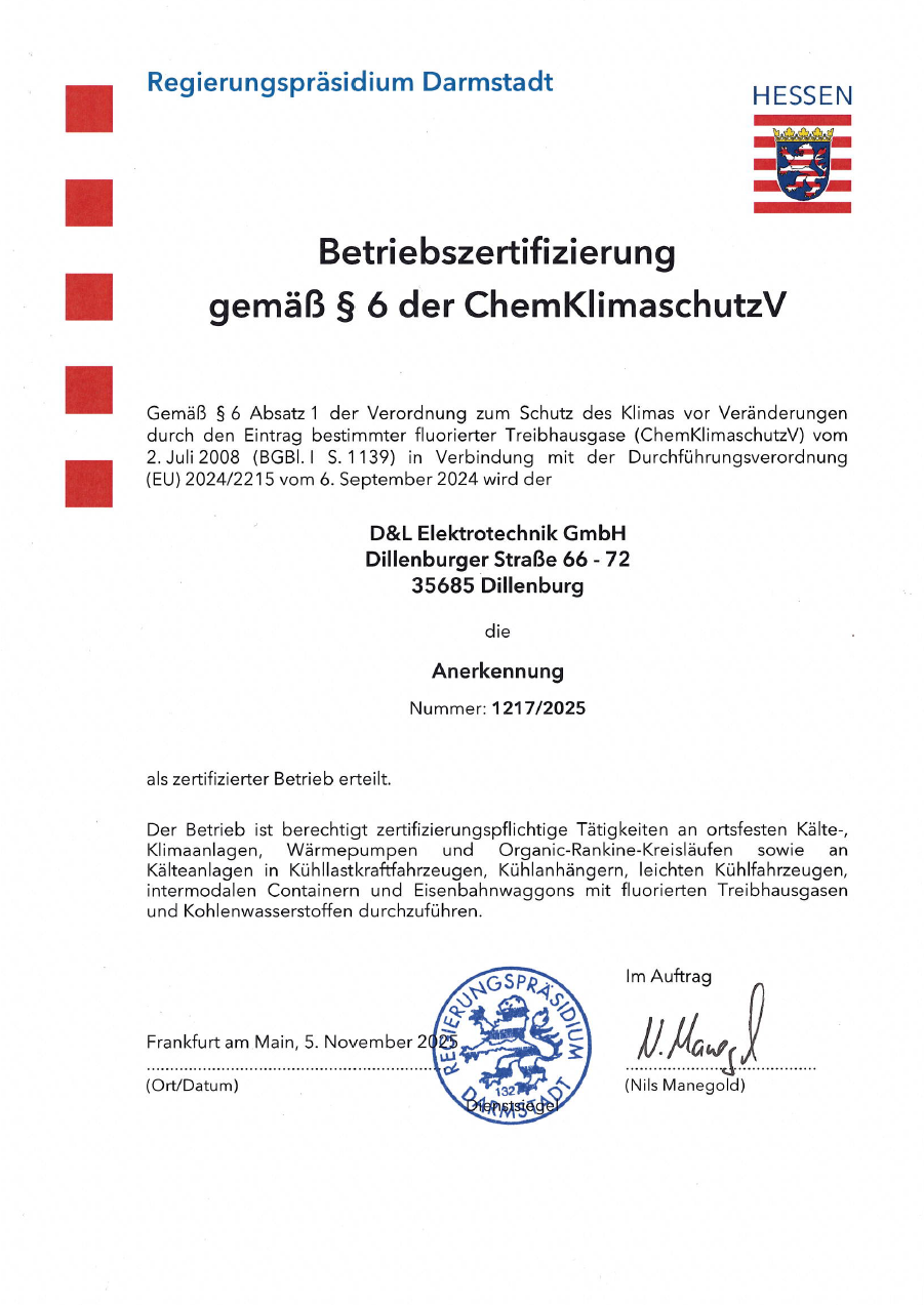 Der Betrieb ist berechtigt, zertifizierungspflichtige Tätigkeiten an ortsfesten Kälte- und Klimaanlagen, Wärmepumpen sowie Organic-Rankine-Kreisläufen (ORC-Anlagen) durchzuführen. Ebenso sind wir zertifiziert für Tätigkeiten an Kälteanlagen in Kühllastkraftfahrzeugen, Kühlanhängern, leichten Kühlfahrzeugen, intermodalen Containern sowie Eisenbahnwaggons mit fluorierten Treibhausgasen und Kohlenwasserstoffen.